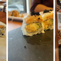 Kani, avocado, mango with lobster salad in soy paper. Red and black tobiko on top. Mango sauce
